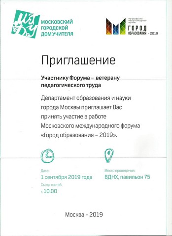 1 сентября 2019 года ветераны педагогического труда нашей Школы (Байкова Л.Н., Перов Н.Ф., Цецхладзе Н.Ю.) в составе делегации МРСД № 24 районов Тёплый Стан и Коньково приняли участие в Московском международном форуме «Город образования – 2019». Спасибо организаторам форума за возможность участвовать в образовательном пространстве столицы!