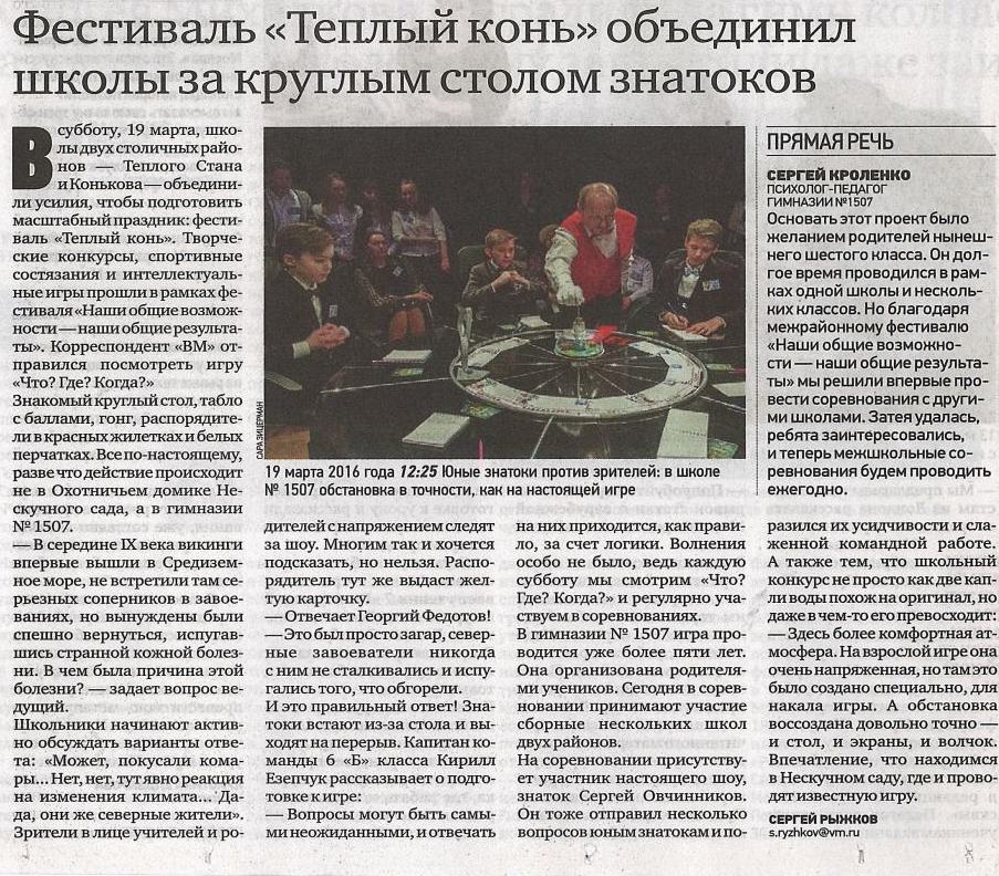 В субботу, 19 марта, школы двух столичных районов — Теплого Стана и Конькова—объединили усилия, чтобы подготовить масштабный праздник: фестиваль «Теплый конь». Творческие конкурсы, спортивные состязания и интеллектуальные игры прошли в рамках фестиваля «Наши общие возможности —наши общие результаты». Корреспондент «ВМ» отправился посмотреть игру «Что? Где? Когда?»