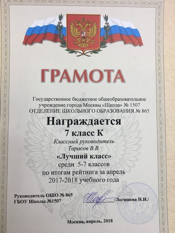 26 апреля 2018 года на линейке порядка кадетам 7К класса Школы № 1507 в очередной раз вручили кубок лучшего класса по итогам рейтинга школы. Молодцы кадеты! Так держать!