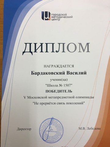 4 мая 2018 года в зале Славы Центрального музея Великой Отечественной войны 1941-1945 годов состоялось награждение победителей пятой Московской метапредметной Олимпиады «Не прервётся связь поколений».