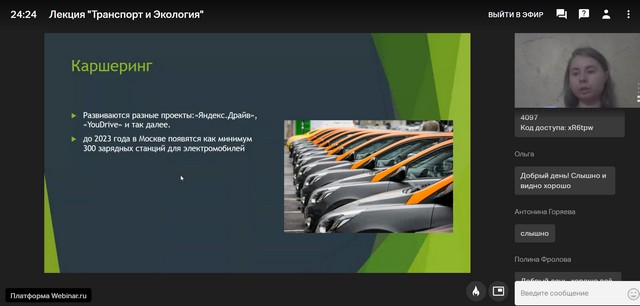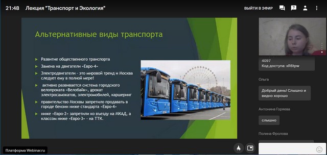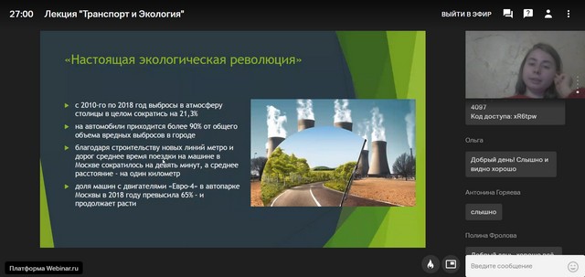 А.Н. Горяева рассказала о современных и будущих проектах развития транспорта Москвы, целью которых является уменьшение вреда, наносимого транспортом экологии города. Оказывается, с 2010-го по 2018 год в нашем городе выбросы в атмосферу сократились на 21.3%! Такого результата удалось достичь благодаря строительству новых линий метро и автодорог за счет сокращения среднего времени поездки на машине. Также в автопарке Москвы растет доля машин с двигателями «Евро-4», выделяющими значительно меньше выбросов, увеличивается количество электромобилей.