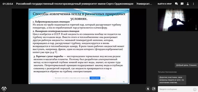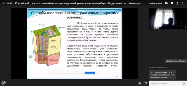 Сотрудник кафедры гидрогеологии Белов К.В. познакомил ребят с техническими принципами и особенностями выработки тепловой и электрической энергии, с основными гипотезами происхождения тепла в недрах нашей планеты и условиями формирования термальных вод. Были рассмотрены способы извлечения тепла в различных природных условиях и трудности, возникающие при разработке месторождений термальных вод.