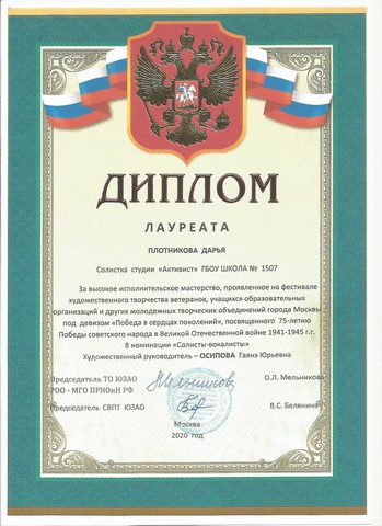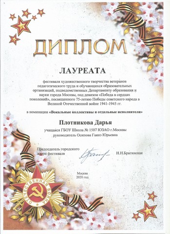 Также поздравляем выпускницу нашей школы Плотникову Дарью, которая награждена Почётными грамотами Лауреата городского Фестиваля художественного творчества ветеранов педагогического труда и обучающихся образовательных учреждений, посвящённого Великой Победе в годы Великой Отечественной войны. Благодарим за такую высокую оценку вокального выступления!