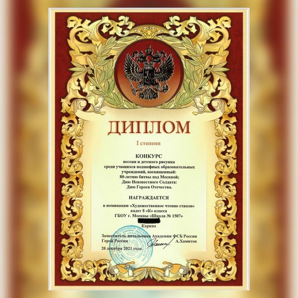 Наши кадеты заняли призовые места в конкурсе чтецов среди подшефных Академии ФСБ России образовательных учреждений, который был посвящен Дням воинской славы России.