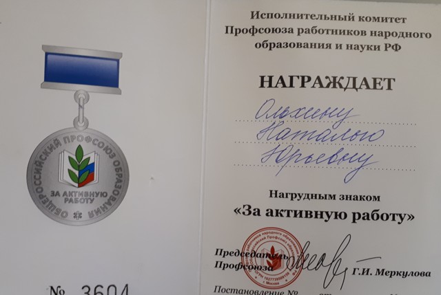 Ольхина Н.Ю. была награждена Почетным знаком «За активную работу» Профсоюза работников народного образования и науки Российской Федерации.