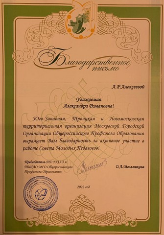 Алексеевой А.Р. была объявлена благодарность за активное участие в работе Совета молодых педагогов.