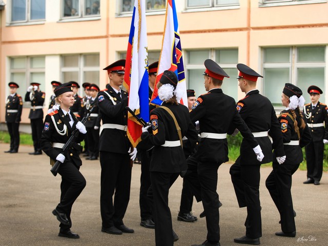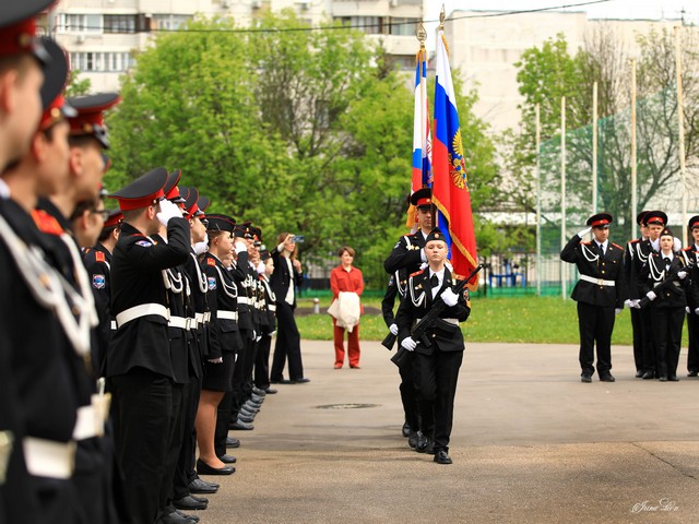 Но сегодня был не только День Последнего школьного звонка для наших дорогих 11-классников. Сегодня мы собрались, чтобы стать очевидцами зарождения новой кадетской традиции в нашей школе – торжественной церемонии прощания выпускников кадетского класса с Флагом Кадетского движения Москвы! Обращаясь с пожеланиями к выпускникам, почётные гости также обратились к обучающимся всех кадетских классов: берегите Знамя и носите кадетскую форму с честью!
