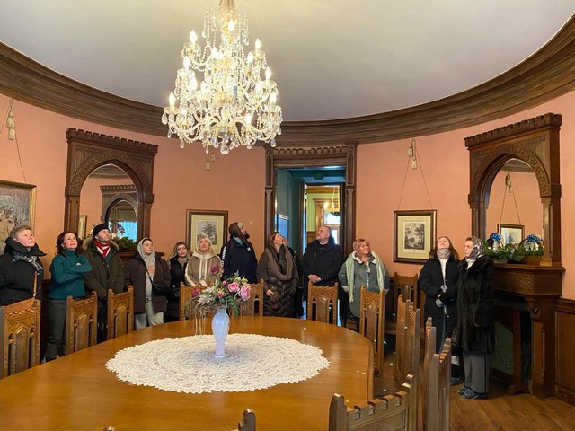 А далее в деревне Жаворонки всех ждала необычная музыкально-кулинарная история в трёх действиях и обед-дегустация русских блюд. Участники экскурсии услышали рассказ о том, какие кушанья традиционно готовили на Руси, узнали о способах их приготовления и секретных ингредиентах, отведали вкуснейшие, ароматные блюда из русской печи, спели под гармонь любимые русские песни.