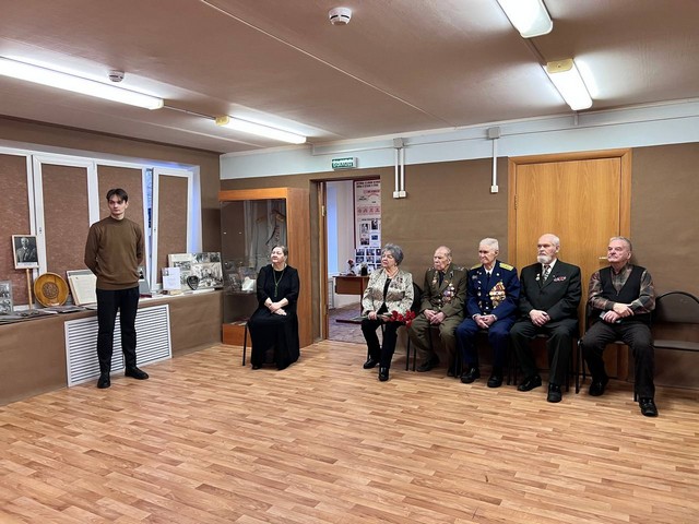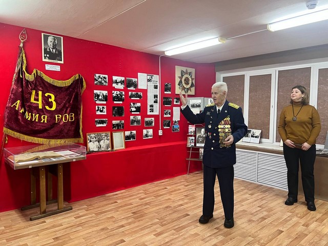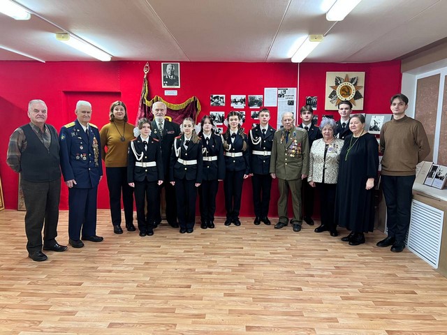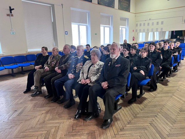 Мероприятие продолжилось в актовом зале школы, где собрались ветераны педагогического труда, учителя и обучающиеся кадетских классов для просмотра фильма, посвященного А.П. Белобородову и его встречах с ветеранами 43 армии ВОВ.