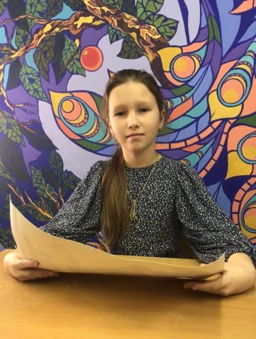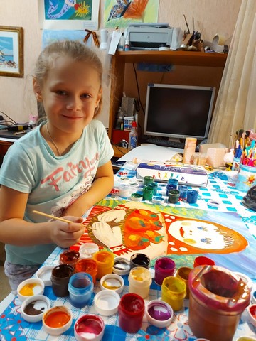 «Название моей работы «Ночь на Ивана Купалу». Этот яркий мистический праздник богат интересными традициями и колоритными обрядами. Я изобразила один их таких обрядов. Незамужние девушки бросали венки, которые сплели из трав и цветов, в воду. Считалось, если венок утонул – замуж в ближайший год не позовут, от берега не отплыл – суженый где-то совсем близки, а если отплыл далеко – сватать будет парень издалека», - Алена, 6 «з».