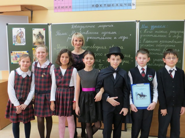 Ребятам было предложено выполнить по группам задание, коротко описать какими они себе представляют леди и джентльмена. Девочки описывали внешность, речь и поступки джентльмена, а мальчики описывали леди. Ответы получились интересными, а родители с удовольствием дополнили их. На уроке была показана инсценировка по правилам вежливости и этикета, а ребята находили ошибки в поведении джентльмена и леди. В конце урока был подведён итог, и мы выяснили, что ребята хотели бы соответствовать образам леди и джентльмена, и будут прикладывать все усилия, чтобы приблизиться к этим идеалам.