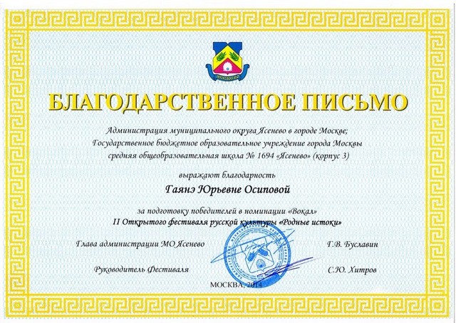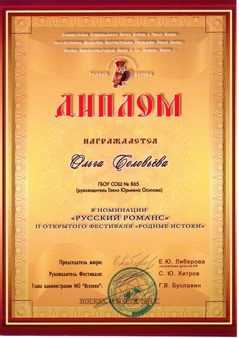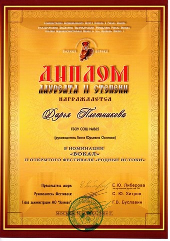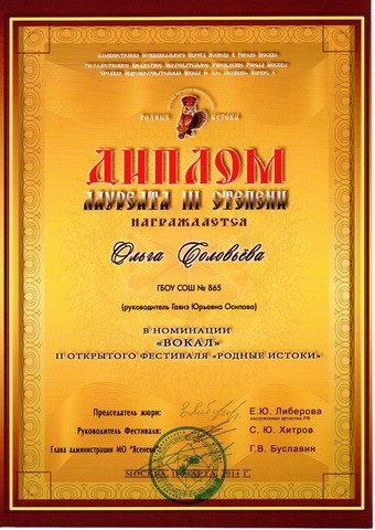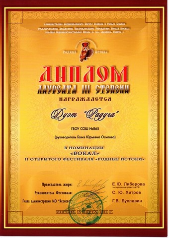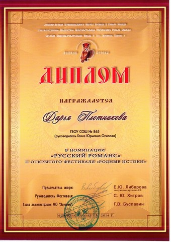 II окружного открытого Фестиваля русской культуры "Родные истоки - 2014". Наши девчонки Оля и Даша (руководитель – Осипова Г.Ю.) стали Лауреатами и Дипломантами этого конкурса в различных номинациях! Также Маша Манухина (9 В класс) и другие воспитанницы из танцевальной студии "Магнит" (школа №1267) стали Лауреатами в номинации "Хореография". Красивым завершением концерта стала финальная песня, где наши девушки и ученик школы № 1107 Эйвазов Тимур в разбивке на три голоса исполнили замечательную песню Игоря Матвиенко «Выйду ночью в поле с конём…»